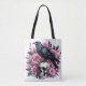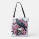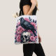 Tote bag features watercolor artwork of a raven perched on a human skull with blooming pink roses in the background. An avian 'pinkoween' (pink Halloween) aesthetic with bubble goth, feminine morbid vibes. Also appropriate for fans of Edgar Allan Poe (ravencore art)!
