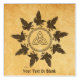 Nine lively ravens (Corvus corax) circle around a knotted Norse/Celtic ring. A triquetra, a triangular figure of three interlaced arcs, appears at center. Everything is superimposed on an old paper background image, giving it a medieval feel. Customize by adding your own text.