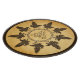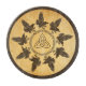 Nine lively ravens (Corvus corax) circle around a knotted Norse/Celtic ring. A triquetra, a triangular figure of three interlaced arcs, appears at center. Everything is superimposed on an old paper background image, giving it a medieval feel. You may change the color of the border ring or remove it altogether.