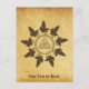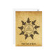 Nine lively ravens (Corvus corax) circle around a knotted Norse/Celtic ring. A triquetra, a triangular figure of three interlaced arcs, appears at center. Everything is superimposed on an old paper background image, giving it a medieval feel. Customize by adding your own text.
