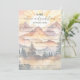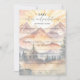 Boho and rustic gender-neutral baby shower design "A little ray of sunshine is on the way" with a watercolor style landscape with mountains, fir trees, and a rising sun.