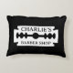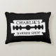 Razor blade logo barber shop decor accent pillow. Custom cushion design for men's hair salon. Stylish gift for hair salon owner. Make your own trendy barber shop decorations for boss, coworker, employees etc. Unique hair stylist gift ideas. Personalized with your own business name or company slogan.