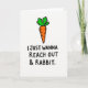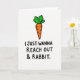 This card shows a bright orange carrot centered near the top, outlined in thick black lines with a leafy green top that fans out like a friendly wave. Beneath it, a big, simple all-caps message reads “I JUST WANNA REACH OUT & RABBIT,” set in black letters that feel like a cheeky note passed between close friends. The pun links the carrot above to an unseen bunny, and it adds a flirty, “thinking of you” tone without needing extra characters 🐰. The layout stays open and airy on a white background, so the carrot and text sit apart with plenty of breathing room. The carrot’s tapered shape points downward toward the words, guiding your eye as if the picture is reaching out to the line below. The contrast between the warm orange and the crisp black lettering makes the message easy to spot at a glance. A tiny touch of spring comes through in the fresh green leaves, like a hint of 🌷. The background remains plain white, with the carrot at the top and the black text stacked neatly underneath.