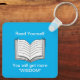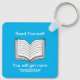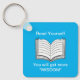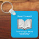 Read Yourself Inspirational Quote keychain. Black and white open book vector illustration with an inspirational quote ''Read Yourself. You will get more WISDOM.'' Fully Customizable. Personalize with your own quote.