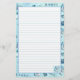 A soft blue lined stationery paper decorated with a book theme featuring books, bookmarks and small flowers painted in watercolor on a robins egg blue background.