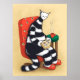 Reading cat book lover poster with a fun illustration of a weird black and white striped cat creature with long neck staying at home. This strange character is staying home, peacefully sitting on an orange chair with eyes, relaxing and reading an enigmatic book. It enjoys a hot cup of coffee in its slippers decorated with eyes.
