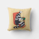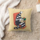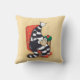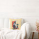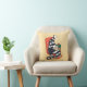 Book nerd pillow with a fun illustration of a weird black and white striped cat creature with long neck staying at home. This strange character is staying home, peacefully sitting on an orange chair with eyes, relaxing and reading an enigmatic book. It enjoys a hot cup of coffee in its slippers decorated with eyes.