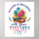 Vibrant, colorful design featuring a dragon with stack of books, the top one open with blue and pink roses. The colorful text reads: "Reading is dreaming with your eyes open". This design is available on a wide variety of products.