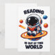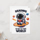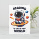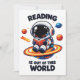 Reading is out of this world shows a cute astronaut sitting on a bright planet while reading a book in space. A playful space themed reading scene for book lovers, students and science fans who enjoy imagination and curiosity.