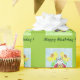 A kid green birthday wrapping paper with the tile illustration of a ladybug reading a book under two yellow flowers and the words "Happy Birthday" written beneath it . Perfect for a spring birthday :) © ArianeC Illustrations