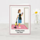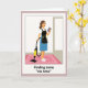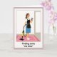 Designed with a modern illustrated look, this card shows a single woman centered in a quiet home scene, wearing a white blouse, a blue skirt, and a black apron edged in yellow. She stands on a pink rug filled with small flower shapes, her relaxed smile and soft gaze suggesting she’s savoring a private, affectionate moment with herself ❤️. In her left hand she holds the handle of a yellow-and-black cleaning machine, the hose and nozzle angled down toward the rug as if she paused mid-task. In her right hand, she lifts a purple-covered book, tilted like she’s sneaking in a few pages between chores, giving the scene an easy, friendly warmth 🌼. The background stays simple with white walls so your eyes stay on her, and a pale gray doorway detail sits off to the right. Any front text would sit neatly above the figure in a clear, dark color, with a smaller line near the bottom in a softer shade. The yellow canister, pink floral rug, and purple book create a bright trio of accents against the mostly white room.