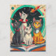 Postcard in an illustration of four cats sitting on an open book, gazing at a rocket soaring through a cosmic backdrop. Each cat sports retro-futuristic space gear, blending vintage sci-fi charm with whimsey. The scene evokes wonder, adventure, and imagination fueled by books.