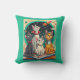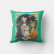Throw pillow in an illustration of four cats sitting on an open book, gazing at a rocket soaring through a cosmic backdrop. Each cat sports retro-futuristic space gear, blending vintage sci-fi charm with whimsey. The scene evokes wonder, adventure, and imagination fueled by books.