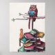 A nerdy owl catching up on his reading, snuggled up in a warm scarf, with an orange cat gazing up from below.