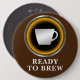 Feelin' like a barista? Just like your coffee machine, you're always Ready to Brew! Rain or shine, morning, noon, or night, it is always a great time for a good cup of coffee. Drip, press, pourover or cold brew, doesn't matter. Design looks like a power button and comes in different colors -- just click the "Edit Design" button to find the different image layers.