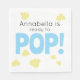 These custom baby shower napkins for a little boy features a cute popcorn theme in blue and yellow. Cartoon popcorn kernels are scattered around the text area. The word "POP" is printed in a soft baby blue color for those expecting a boy.
