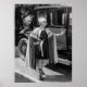 Old photo of a pretty woman standing next to antique car. Outfit looks like she is headed to a wrestling match. 1920s women's fashion photograph.
