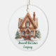 This cute custom realtor Christmas ornament gift has your personalized realty company name and Happy Holidays message in chic green typography along with a beautiful image of a house in the winter surrounded by pine trees. Professional holiday gifts for real estate business marketing.