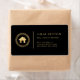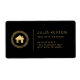 This real estate business shipping label features a faux gold house logo framed by a circular Greek key motif on the left and simple, gold colored sans serif text on the right, with a vertical line between, on a black background.