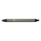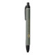 This real estate branded ink pen features a faux gold house logo framed by a circular Greek key motif on the left and simple, gold-colored sans serif text on the right, with a vertical line between, on a sage green background.