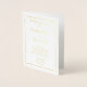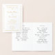 Real gold foil Great Gatsby Art Deco wedding ceremony programs (greeting cards) with changeable gold foil text on the front and back side and black text inside the card, printed on white background. Dimensions of greeting card are 5 inches by 7 inches.