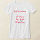 My overall review is that the T-shirt is nice, it fits true to size however the font is significantly smaller than advertised and you can't read it. The printing is unreadable and there is a strain to read it. It does not look like the advertised product. Maybe the shirt color is darker or a larger more visible font should have been used. Photos with and without flash and font is barely legible.