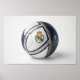 Wall art: A design of a sleek and elegant football, where the Real Madrid crest is creatively integrated into the ball. The ball features clean and interwoven lines, with highlights in the royal colors of white, gold, and navy blue.