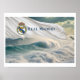 An artistic design featuring soft white waves flowing across the canvas, inspired by the energy of Real Madrid fans. The club’s crest is seamlessly integrated at the top, with blue and golden accents.