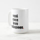 White mug with black text
