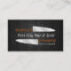 This business card features a pair of realistic looking large chef's knife against a dark toned wood background. Great for personal chefs, catering businesses, and restaurants.