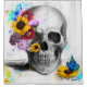 Original digital painting. Realistic human skull in grey scale, colorful wild flowers and butterflies growing from eye socket. White background. Watercolor paint splatter. Yellow sunflowers, pink and purple daisies and red poppies. Modern sugar skull design.