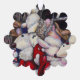 Original whimsical painting of Holiday Dollys by well-season Fine Art Artist, Gaye Elise Beda. A gathering of anthropomorphic mice is dressed in festive, holiday-themed clothing. Their bright red outfits and striped socks create a joyful and playful scene, with each mouse uniquely adorned. The background suggests a wintry setting, enhancing the festive mood.