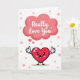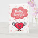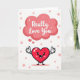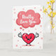 This greeting card features an anthropomorphic red heart character near the bottom, smiling wide with long lashes and soft rosy cheeks, as if beaming at someone it adores 🥰. Two white-gloved hands lift outward in a welcoming, almost-hugging pose, while tiny black legs keep the heart planted in place. Above it floats a layered pink thought bubble, like a sweet daydream hanging in the air. Inside the bubble, the words “Really Love You” appear in white, centered and easy to spot against the pink. Small white star sparkles sit around the lettering, adding a gentle twinkle that makes the message feel extra tender ❤️. The background stays white and airy, scattered with pastel pink polka dots that look like confetti drifting across the space. The overall palette sticks to red, pink, and white, with the heart at the bottom and the thought bubble hovering above to form a simple vertical layout. The pink dots vary in size across the white backdrop, framing the heart and thought bubble without crowding them.