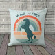 On this throw pillow, a blue silhouette rearing horse is placed on a retro style circle rainbow background of distressed fabric stripes. The custom text above the image is also distressed. Currently it says "Wild and Free, but you can easily change it to anything else you'd prefer. The back of the pillow has the same image with a text field that can hold your name.