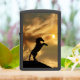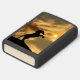 A zippo lighter with a horse rearing on the top of a mountain with a sun in clouds. A beautiful lighter!