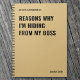 Personalize this "Reasons Why I'm Hiding from My Boss" cover with a custom name printed at the bottom for a unique touch.