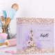 A recipe notebook for French, Parisian themed recipes. A violet background with rose gold confetti, and The Eiffel Tower, Paris with flowers. Add a name, text.