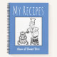 A notebook for recording favourite recipes and cookery tip and tricks. Add the name of the owner and compiler to make this a truly personal item that will be long treasured. Illustration of a woman with chef's hat, up a stepladder, icing a cake, and colour theme of blue and white.