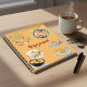 The front features delightful, hand-illustrated food scenes including pizza, seafood, noodles, sushi, and fresh ingredients, all arranged in a playful yet elegant layout. Set against a warm mustard-yellow background, the design feels cozy and inviting—perfect for the heart of the home: the kitchen.