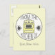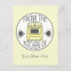 A recipe postcard featuring an illustration of an off white background and a white circle at center. Illustration of a retro yellow stove with a heart on each side and text above and below which reads "From the Kitchen Of" inside circle. Personalize with your name at bottom. Opposite side features a white rectangle with gray scalloped edges and old fashioned photo corners at right. Text inside rectangle reads "Recipe." Look for matching items at Jill's Paperie.