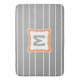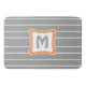 Rectangle Bath mat in 3 different sizes. Gray bathroom rug with gray and white stripes and a center medallion for your initial. White, Gray and Orange. Matches our Retro Bath Line.