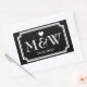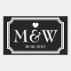 Rectangle black and white monogram wedding favor stickers. Cute heart with monogrammed name initials of bride and groom plus date of marriage. Personalized thank you stickers or envelope sealers / seals. Elegant typography for bride and groom name initials. Chic border design / fancy design. Customizable background color. Romantic love theme label design.