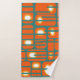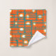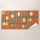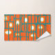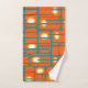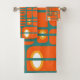 This towel set has a mid-century modern design of orange rectangles with white and gold circles in them and teal horizontal lines crossing them on a field of teal.