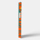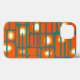 This phone case has a mid-century modern design of orange rectangles with white and gold circles in them and teal horizontal lines crossing them on a field of teal.