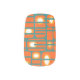 This nail art has a mid-century modern design of orange rectangles with white and gold circles in them and teal horizontal lines crossing them on a field of teal.