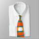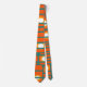 This tie has a mid-century modern design of orange rectangles with white and gold circles in them and teal horizontal lines crossing them on a field of teal.