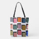 This tote bag has a Bauhaus design of rectangles with designs inside and their shadows behind.