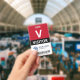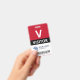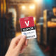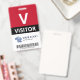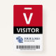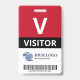 Vertical visitor badge with a large V against a white background. Visitor beneath in clean letters. Add your logo and bar code. Visitor badge personalized with logo and barcode in a minimalist design in red, white, and black.