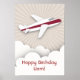 A birthday poster featuring an illustration of a white airplane with red stripe flying above the clouds over a sunburst background. Matching birthday party invitations, stickers, and more are available at Jill's Paperie.