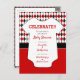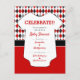 Oversized elegant argyle pattern in school colors of red and black set the backdrop for this cute baby shower design. A white baby bodysuit has all the text written on it for the big event, which can be a couples shower or just for mom. Design comes in maroon and gray, burnt orange and gray, red and black, green and black, orange and navy, green and yellow, and purple and gray. Matching products available.